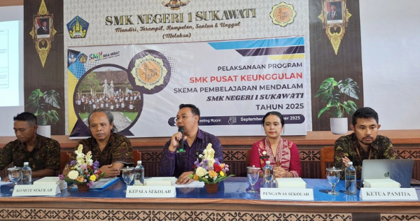 SMKN 1 Sukawati menggelar rapat koordinasi internal terkait pelaksanaan Bantuan Pemerintah SMK Pusat Keunggulan (SMK PK) Skema Pembelajaran Mendalam Tahun 2025. Rapat yang dihadiri oleh Pengawas Sekolah, Ni Wayan Ekayanthi, S.Pd., M.si. dan Ketua Komite Sekolah, I Made Sumadiyasa, S.S dilaksanakan pada Jumat, 12 September 2025, di SMKN 1 Sukawati. Kegiatan ini menjadi langkah awal untuk memastikan program berjalan sesuai rencana dan memberikan dampak positif bagi peningkatan kualitas pendidikan di sekolah.