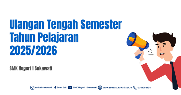Diberitahukan kepada seluruh siswa/i SMK Negeri 1 Sukawati, bahwa Ulangan Tengah Semester (UTS) Tahun Pelajaran 2025/2026 akan diselenggarakan mulai hari Senin, 23 September 2025 hingga Jumat, 3 Oktober 2025. Seluruh siswa/i diharapkan mempersiapkan diri dengan sebaik-baiknya dan mengulang materi pelajaran yang telah diberikan.